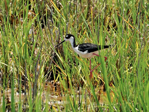 The Wood Stork had just flown in and settled in the grass. Watching it, I became aware of high, agitated calls that sounded like breek! breek! and saw one or two smaller birds darting up again and again close to the Wood Stork. Looking closer, I saw with amazement a slender black and white bird with impossibly long, thin red legs – a Black-necked Stilt.