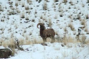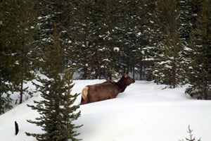 Along the way, we passed bald eagle, bighorn sheep, pronghorn antelope, mule deer, three coyotes, and began to see a few elk here and there. We saw common goldeneye ducks in the river, American magpies flashing black and white, and the first of many ravens. But mostly on that drive into Yellowstone, the wildlife sightings were distant glimpses, dwarfed by the landscape, the jagged and snow-covered mountains, the panoramic sweeps of snow and river and rock and green-black evergreen trees, and the sense of entering a place where life is lived on a far grander scale.