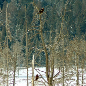 Then they flew. One went behind a slope and out of our sight, but the other, to our amazement, flew directly toward us and almost over us, very low and close. It was awesome, in the purest sense of the word. The eagle looked quite dark and patterned in different shades of brown as it passed over and flew out of sight behind the snowy slope or ridge, where one member of our group could see that it had perched in a tree. Then the other golden eagle came flying back over the ridge-top low and fairly close – and calling in a chattering way, very clearly. Then it, too, disappeared. Suddenly they were gone. The snow and the sky and the valley seemed empty and quiet.