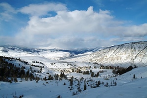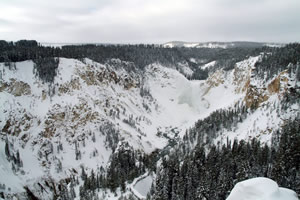 About mid-morning, we arrived at an overlook from which we could see the lower and upper falls of the Yellowstone River – frozen into massive, pale green cascades rimmed with icicles and delicate crystalline sprays, with milky-gray water still pouring from cracks in the ice-sculptured falls – and the Grand Canyon of the Yellowstone, its cavernous yellow rock walls and cliffs clotted with thick accumulations of snow, and the chalk-green river flowing at the bottom far below.