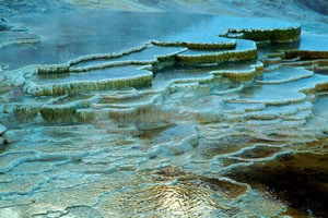 After a late lunch and brief rest at the lodge, we joined the group for a walk around the hot springs that give Mammoth Hot Springs its name, and the step-like “travertine terraces” that form around the springs. The terraces are formed by water heated by the geologic forces below the Yellowstone region, which combines with gasses to form an acidic solution that dissolves limestone deposits and carries them to the surface. There they solidify in the form of travertine, a sedimentary rock.