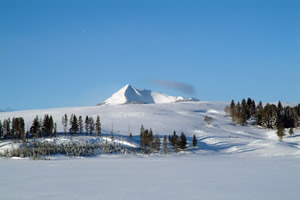 The next morning we climbed into snow coaches – passenger vehicles designed to travel over snow and ice – for a day of sightseeing on the way from Mammoth Hot Springs to the Old Faithful Snow Lodge. We headed out around 8:00 into another beautiful, sunny, very cold day, and bounced along through valleys and mountains covered in snow, passing steam from hot springs here and there, ridges lined with dark fir, spruce and lodgepole pine, scattered elk and bison, and somewhere along the way a pair of American dippers flying low over a stream, and mallards, buffleheads and goldeneye ducks.